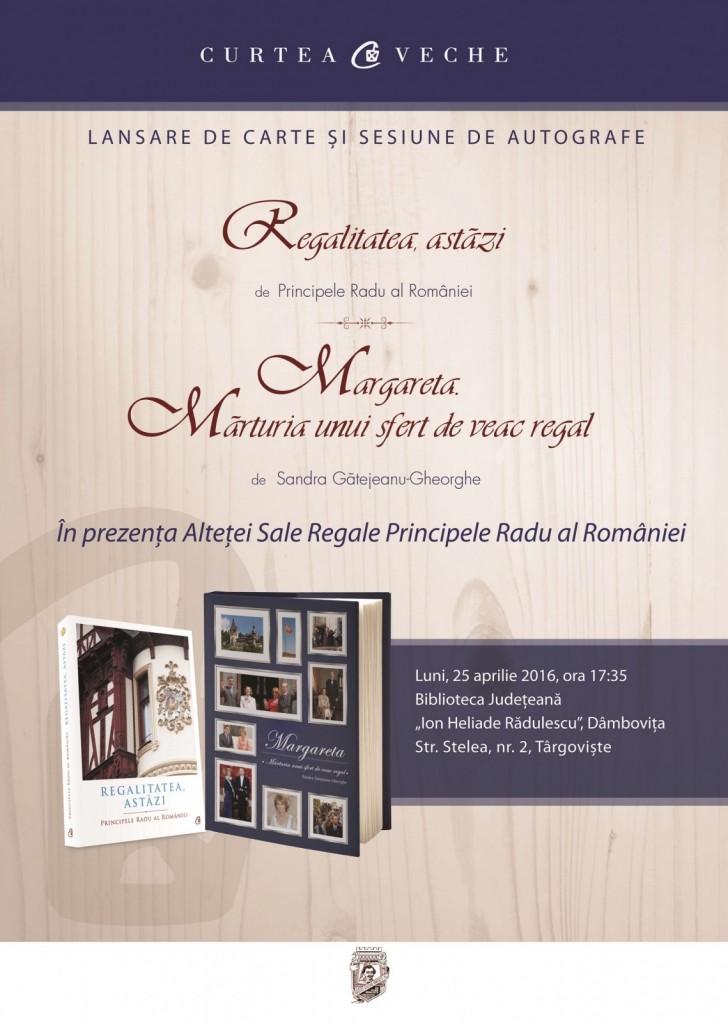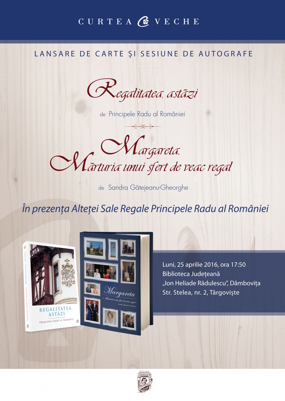 Curtea Veche Publishing, alături de Biblioteca Județeană “Ion Heliade Rădulescu” Dâmbovița vă invită luni, 25 aprilie 2016, începând cu ora 17.35, la o dublă prezentare de carte regală în prezența Alteței Sale Regale Principele Radu al României. La eveniment vor fi prezentate volumele „Regalitatea, astăzi” de Principele Radu al României și „Margareta. Mărturia unui sfert de veac regal” de Sandra Gătejeanu-Gheorghe.