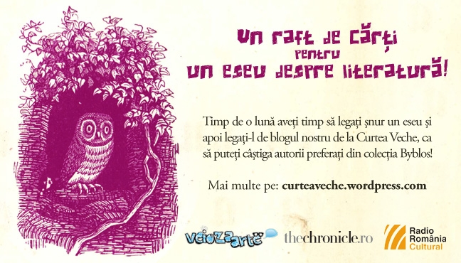scrieţi un eseu despre literatură şi puteţi câştiga un raft întreg de literatură universală (25 de volume)! Noi vă cerem trei paragrafe despre literatură şi vă oferim, în schimb, literatură de cea mai bună calitate: din China, Argentina, Chile, Cuba, Spania, Portugalia, Germania, Turcia, Ungaria, Rusia, Marea Britanie şi, bineînţeles, America – pe scurt, un raft întreg cu cele mai bune cărţi din colecţia Byblos de la Curtea Veche.