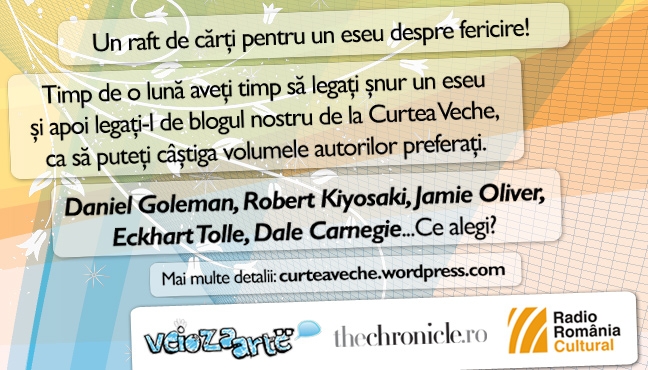 Acum două săptămâni vă propuneam să scrieţi pe blogul vostru un eseu despre fericire pentru a câştiga 25 de volume, la alegere din colecţiile non-fiction Curtea Veche. Vă puteţi inspira de la autorii noştri: Kiyosaki, Carnegie, Goleman, Edward de Bono sau chiar Jamie Oliver!