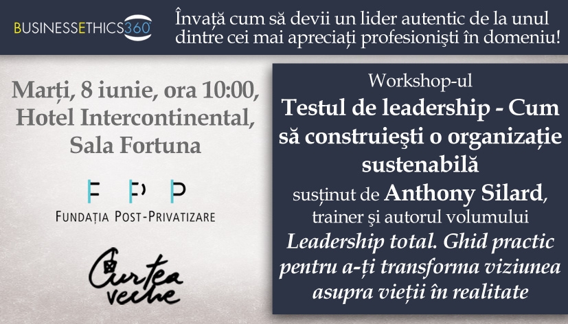 În data de 8 iunie, în sala Fortuna a Hotelului Intercontinental, vom reuni lideri corporativi şi organizaţionali, manageri şi antreprenori la conferinţa “Testul de leadership – Cum să construieşti o organizaţie sustenabilă”, sub sloganul Listen, Learn, Lead.