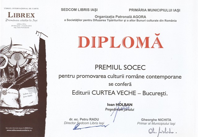 În perioada 29 februarie – 4 martie a avut loc la Iași Târgul Internațional de Carte LIBREX, unde Curtea Veche Publishing a primit Premiul SOCEC, acordat editurilor pentru promovarea culturii române contemporane. Curtea Veche Publishing a înţeles cât de importantă este susţinerea scriitorilor români, dovadă fiind volume precum „Rubato” de Răzvan Petrescu, „Bulevardul visurilor” de Ana Cioclov, „Deadline” de Adina Rosetti și multe alte.