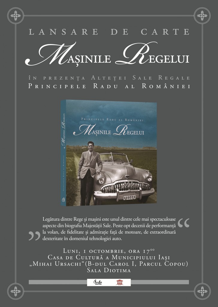 Vă invităm luni, 1 octombrie 2012, începând cu ora 17.00, în Sala Diotima a Casei de Cultură a Municipiului Iaşi „Mihai Ursachi” (B-dul Carol I, Parcul Copou) pentru a participa la evenimentul de lansare a volumului „Maşinile Regelui” de ASR Principele Radu al României. Lansarea va sărbători o pasiune de peste opt decenii a Majestăţii Sale Regelui Mihai I al României – automobilul – şi va avea loc în prezenţa Alteţei Sale Regale Principele Radu.