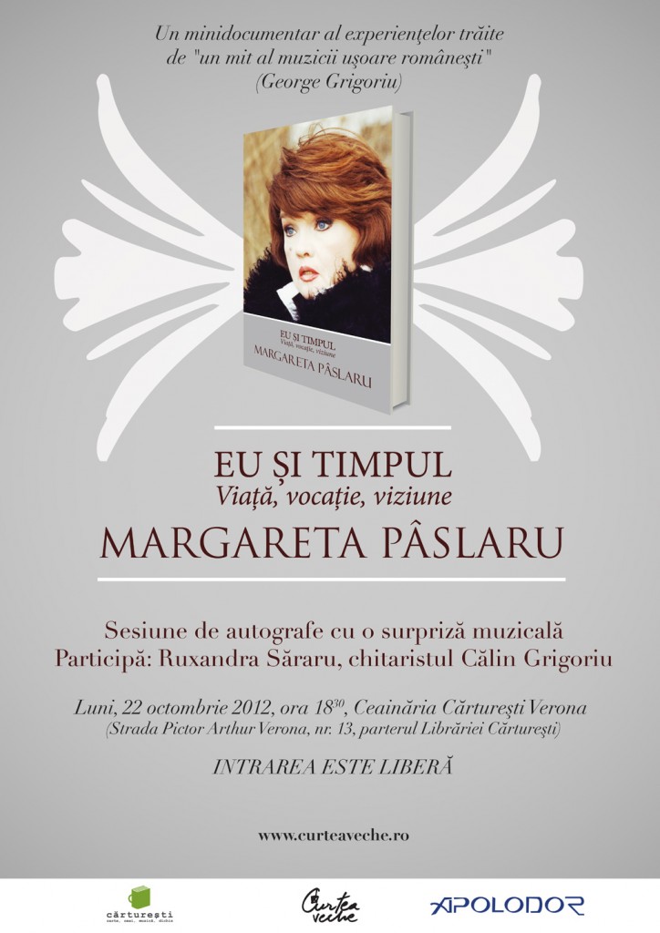 Fanii Margaretei Pâslaru o vor putea reîntâlni pe artistă luni, 22 octombrie, începând cu ora 18.30, în cadrul unei sesiuni de autografe în jurul volumului “Eu şi Timpul. Viaţă, vocaţie, viziune”, apărut la Curtea Veche Publishing. Evenimentul, ce va avea loc la ceainăria din incinta Librăriei Cărtureşti Verona (Str. Pictor Arthur Verona, nr.13), o va avea ca invitată pe Ruxandra Săraru şi va include o surpriză muzicală pregătită de Margareta Pâslaru alături de chitaristul Călin Grigoriu.