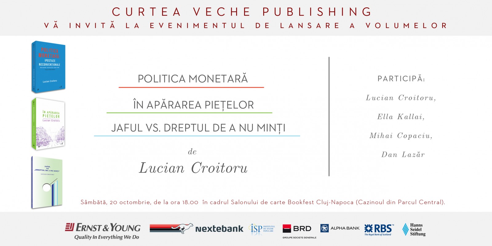 Vă invităm sâmbătă, 20 octombrie, începând cu ora 18.00 la evenimentul de lansare a volumelor „Politica monetară”, „În apărarea pieţelor” şi „Jaful vs. Dreptul de a nu minţi” de Lucian Croitoru. Lansarea va avea loc la etajul I al Centrului de Cultură Urbană Casino din Parcul Central, în cadrul Salonului de Carte Bookfest Cluj-Napoca. La eveniment vor lua cuvântul alături de autor Ella Kallai (economist-şef Alpha Bank), Mihai Copaciu (economist BNR) și Dan Lazăr (Prorector al Universității „Babeş-Bolyai” din Cluj-Napoca).