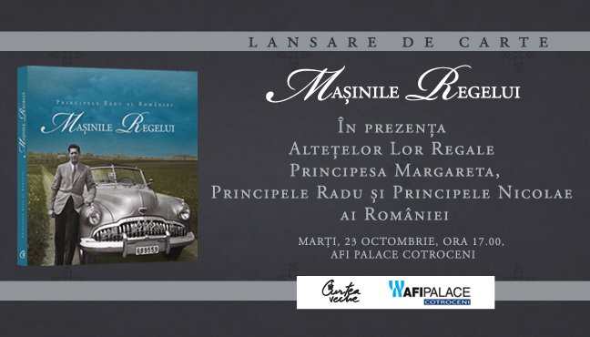 Lansarea volumului „Maşinile Regelui”, semnat de ASR Principele Radu, face parte din evenimentele regale din jurul aniversării zilei de naştere a Majestăţii Sale Regelui Mihai I al României. Marţi, 23 octombrie, începând cu ora 17.00, volumul va fi prezentat publicului în prezenţa Alteţelor Lor Regale Principesa Margareta, Principele Radu şi Principele Nicolae ai României. La evenimentul ce va fi găzduit de AFI Palace Cotroceni (B-dul Vasile Milea nr. 4, parter, culoarul Champs-Élysées), vor lua cuvântul Sandra Gătejeanu, Director de Protocol al Casei Regale, şi Iren Arsene, Managing Partner Curtea Veche Publishing. Seria evenimentelor dedicate acestui volum a fost deschisă pe 28 septembrie la Muzeul Naţional de Istorie din Bucureşti, continuând cu lansările de la Iaşi (1 octombrie) şi Oradea (12 octombrie).