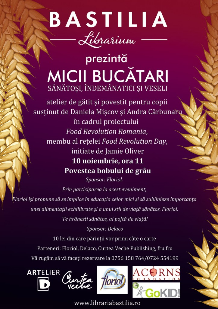 Sâmbăta viitoare, 10 noiembrie, de la ora 11.00, continuăm seria de ateliere „Micii Bucătari”, o inițiativă în parteneriat cu Food Revolution Romania, găzduită de Librăria Bastilia. Inspirate de faimoasa campanie “Food Revolution”, demarată de bucătarul Jamie Oliver, pentru schimbarea obiceiurilor alimentare din școlile americane și britanice, atelierele au ca obiectiv familiarizarea copiilor cu alimentația sănătoasă de la vârste fragede. O educație alimentară corectă presupune, în primul rând, cunoașterea și recunoașterea ingredientelor de către copii, care pot determina, de multe ori, alegerea meniului zilnic în familie.