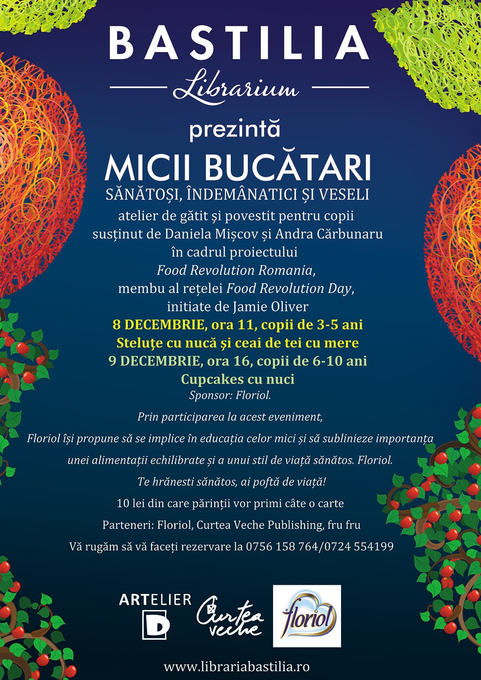Participarea la ateliere se face doar pe bază de înscriere, iar pentru 8 si 9 decembrie toate locurile au fost ocupate. Taxa de participare este 10 lei/familie și va include o carte, atelierul durează o oră și va avea loc la Librăria Bastilia (str Piaţa Romană nr. 5). Durata atelierelor de gătit este de 1 oră (in funcţie de finalizarea reţetei). Taxa de participare este de 10 lei, cu o carte (de reţete) inclusă.