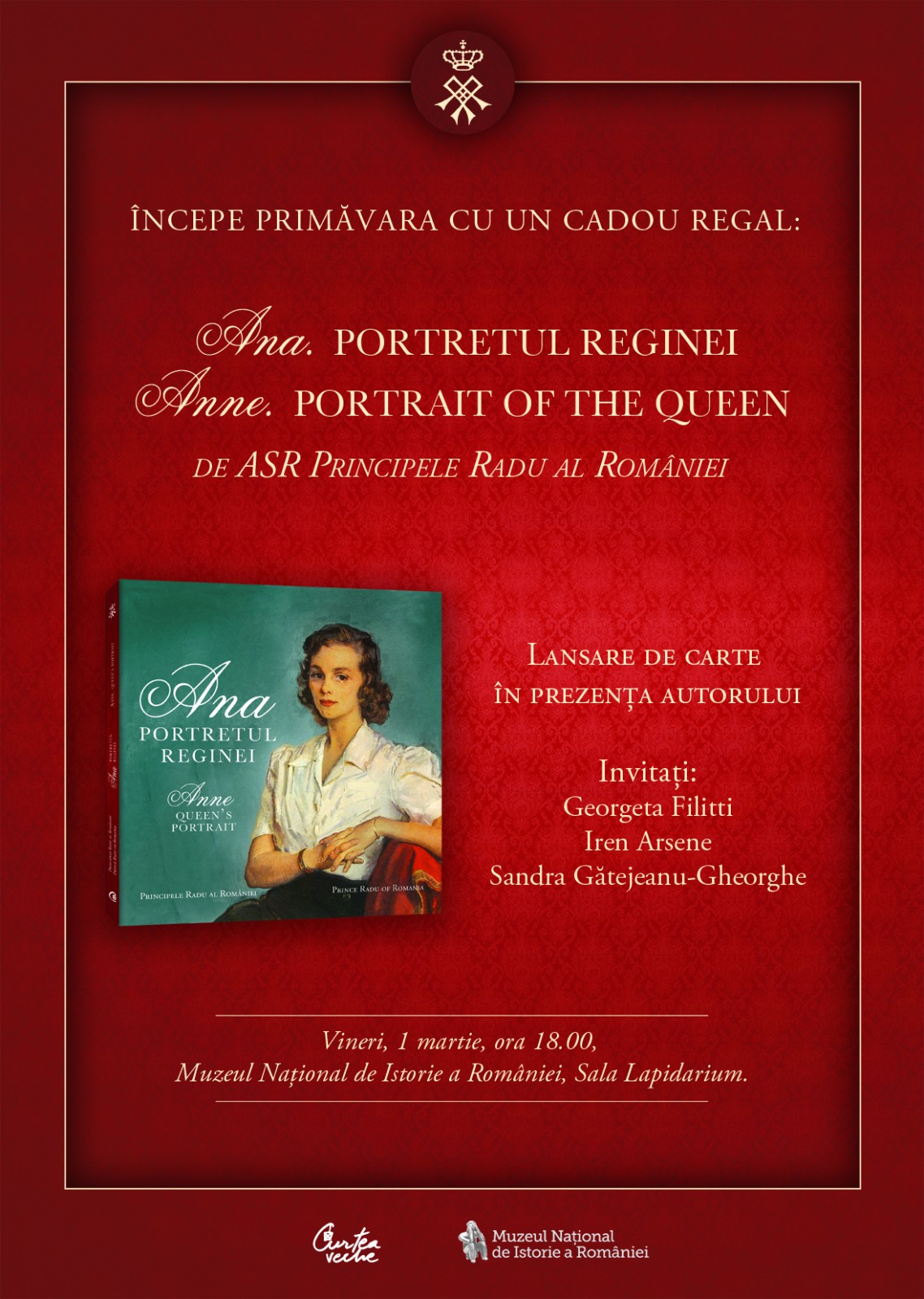 Curtea Veche Publishing lansează vineri, 1 martie, volumul bilingv româno-englez “Ana. Portretul Reginei/ Anne. The Queen’s Portrait”, semnat de ASR Principele Radu al României. Lansarea va avea loc la Muzeul Naţional de Istorie a României începând cu ora 18.00.  Volumul fiind dedicat Reginei, iar perioada 1-8 martie având o însemnătate specială, Alteţa Sa Regală Principele Radu le va invita să ia cuvântul pe trei doamne apropiate Familiei Regale: Sandra Gătejeanu-Gheorghe, Director de Protocol al Casei Regale, Iren Arsene, Managing Partner Curtea Veche Publishing, Georgeta Filitti, istoric.