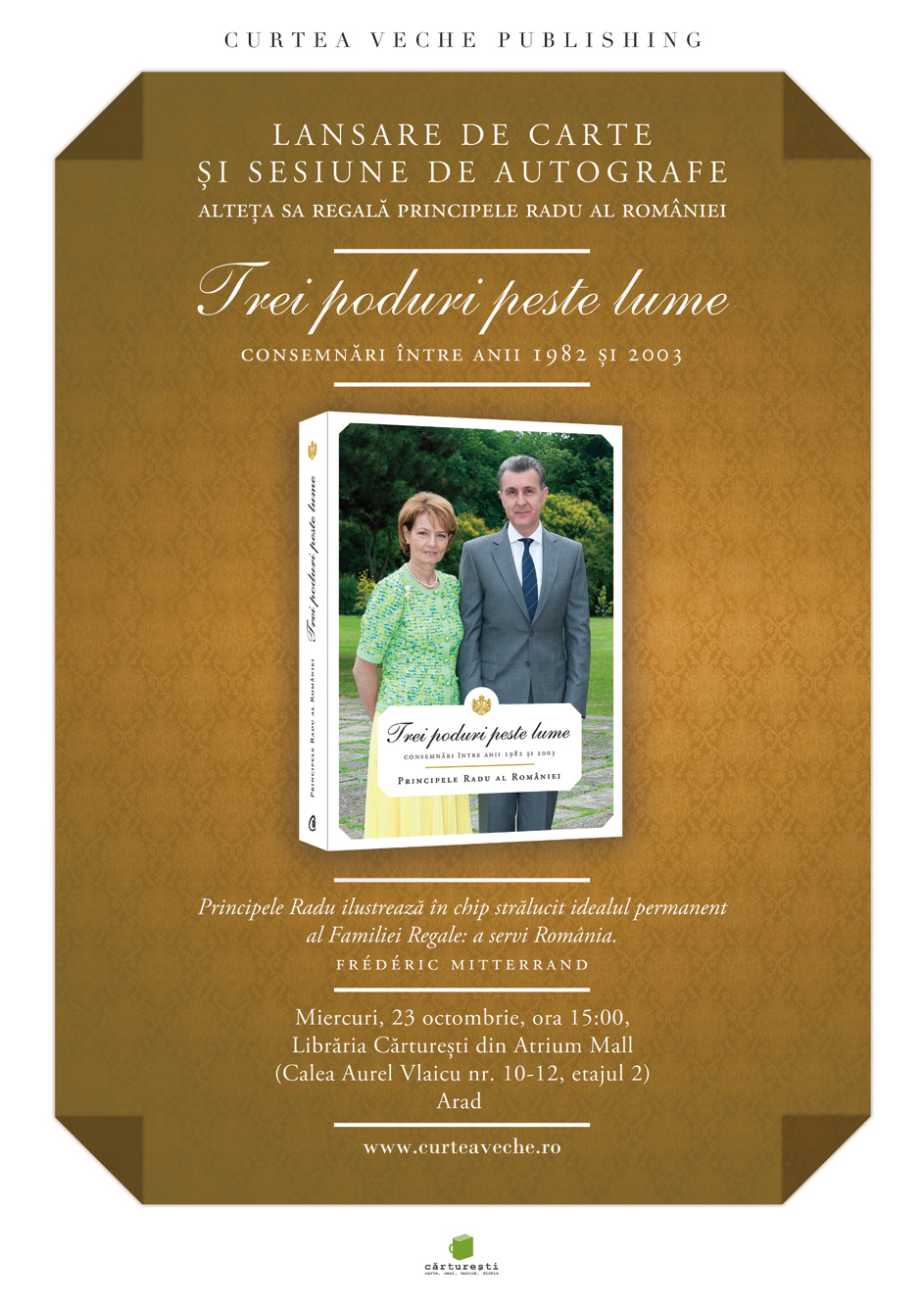 Curtea Veche Publishing vă invită miercuri, 23 octombrie, la evenimentele de lansare a volumului “Trei poduri peste lume. Consemnări între anii 1982 și 2003” de ASR Principele Radu al României care vor avea loc în Arad și Timișoara. Lansarile volumului vor avea loc în prezența Alteței Sale Regale Principelui Radu: miercuri, ora 15.00, la Librăria Cărturești din Atrium Mall (Calea Aurel Vlaicu nr. 10-12, Arad), respectiv miercuri, ora 17.00, la Librăria Cărturești din Iulius Mall (Strada Demetriade nr 1, etajul I, Timișoara). Evenimentele continuă astfel turneul național de promovare a cărții, fiind precedate de lansări notabile în Alba Iulia, Buzău și București.