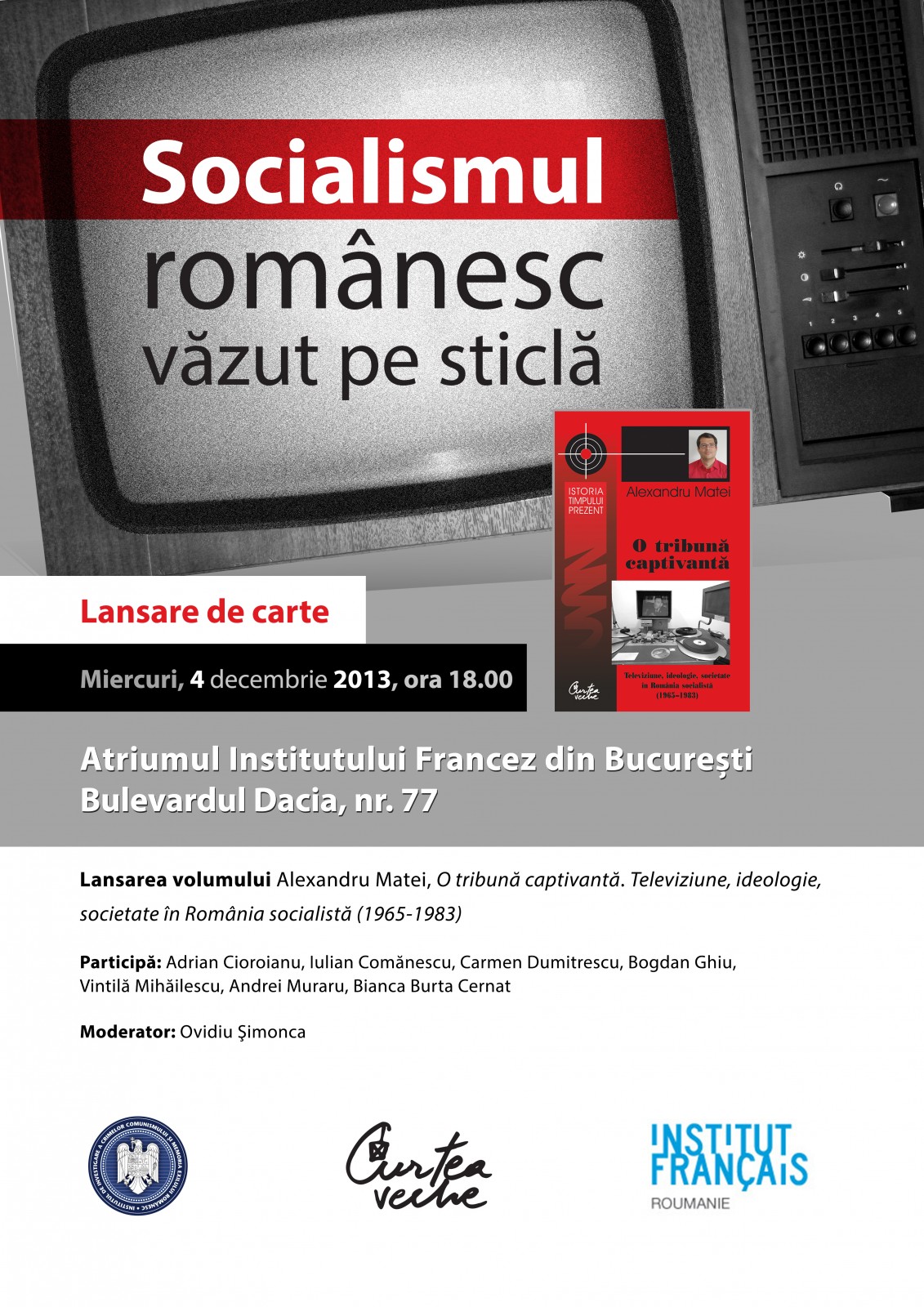 Curtea Veche Publishing invită cititorii la evenimentul de lansare a cărţii „O tribună captivantă. Televiziune, ideologie, societate în România socialistă (1965-1983)” de Alexandru Matei, un volum ce ridică întrebări pertinente despre rolul Televiziunii Române socialiste, atât ca fereastră spre cultura de masă europeană, cât şi ca instrument politic şi ideologic. Evenimentul va avea loc miercuri, 4 decembrie, la ora 18.00, sub forma unei dezbateri, în Atriumul Institutului Francez (Bulevadrul Dacia nr. 77). Discuţia va fi moderată de Ovidiu Şimonca şi va beneficia de prezenţa autorului şi a unor experţi în domeniul istoriei şi comunicării media: istoricul Adrian Cioroianu, specialistul media Iulian Comănescu, cunoscuta realizatoare Carmen Dumitrescu, scriitorul Bogdan Ghiu, antropologul Vintilă Mihăilescu, istoricul Andrei Muraru, director IICCMER, şi criticul Bianca Burta Cernat (Observator cultural). Lansarea este organizată în parteneriat cu IICCMER şi Institutul Francez din Bucureşti.