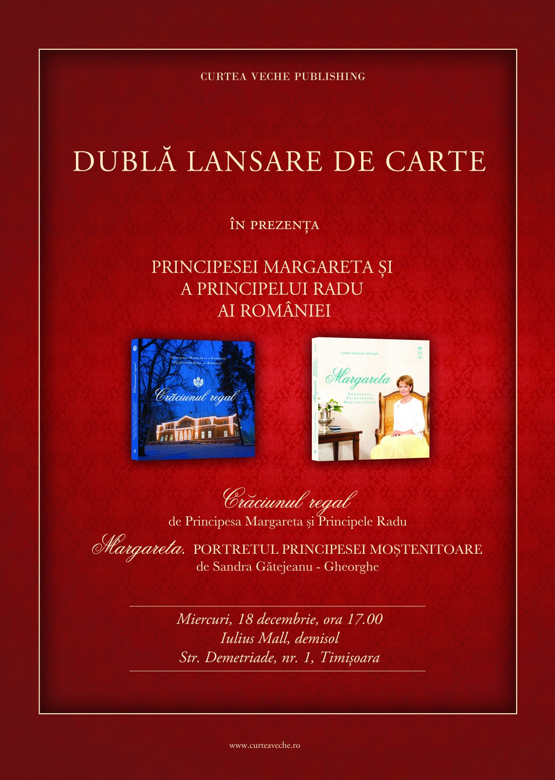 Miercuri, 18 decembrie 2013, începând cu ora 17.00, Curtea Veche Publishing invită cititorii din Timişoara la o dublă lansare de carte regală, găzduită de Iulius Mall din Timişoara. Volumele “Crăciunul regal” şi “Margareta. Portretul Principesei Moștenitoare” vor fi lansate în prezenţa Alteţelor Lor Regale Principesa Margareta şi Principele Radu ai României. Oficiile de gazda for fi facute de Brîndușa Armanca, iar evenimentul va fi urmat de o sesiune de autografe.