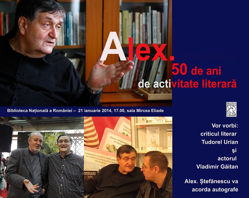 185072_478026872242735_714066106_nMarți, 21 ianuarie 2014, de la ora 17.00, la Biblioteca Națională a României (Sala Mircea Eliade – Parter) va avea loc evenimentul Alex. Ștefănescu – 50 de ani de activitate literară.