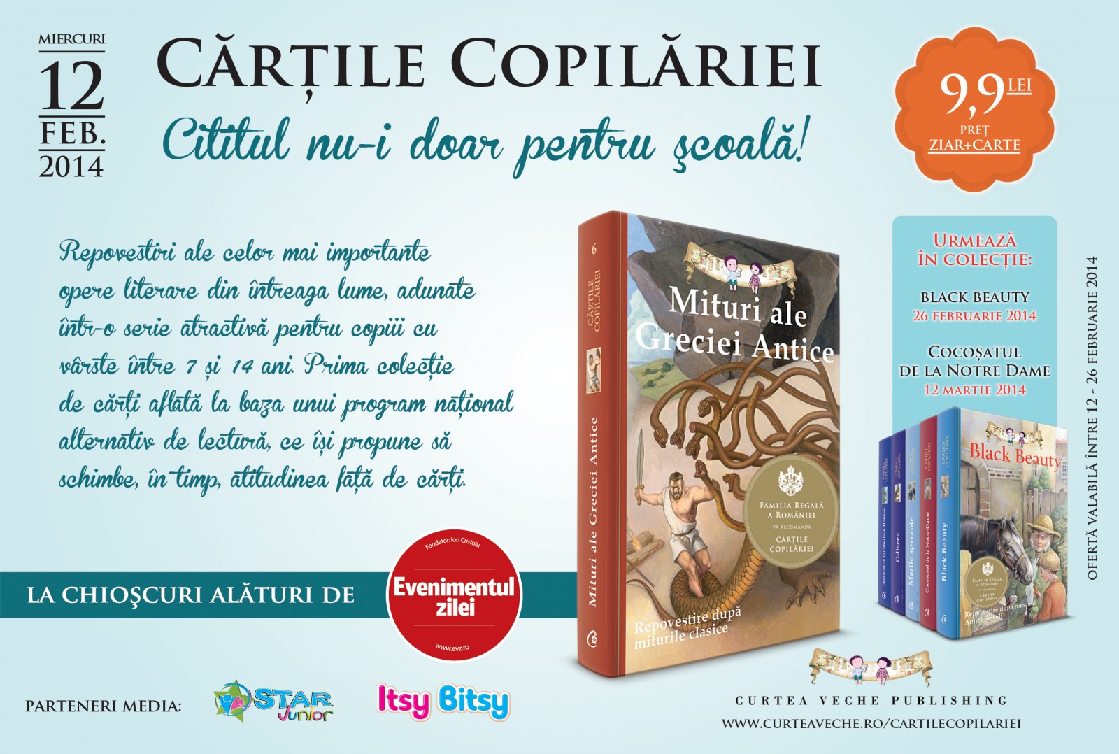 Veste bună pentru Cititorii de Curtea Veche: începând de astăzi, 12 februarie 2014, puteți găsi colecţia „Cărţile copilărei” la toate chioşcurile de ziare din ţară, alături de „Evenimentul zilei”! Primul volum din colecție, „Mituri ale Greciei Antice. Repovestire după miturile clasice”, va fi disponibil la doar 9,99 lei, alături de ziar.