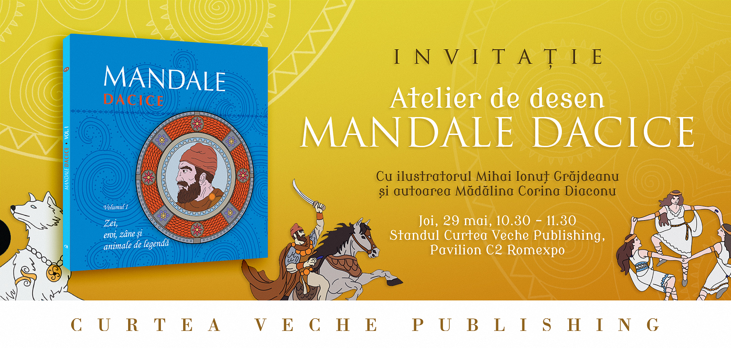 Joi, 29 mai, între 10.30 – 11.30, cei mici sunt invitați la un atelier de desen pe marginea cărții “Mandale dacice”, alături de autoarea Mădălina Corina Diaconu și ilustratorul Mihai Ionuț Grăjdeanu, la standul Curtea Veche Publishing, Pavilion C2 Romexpo.