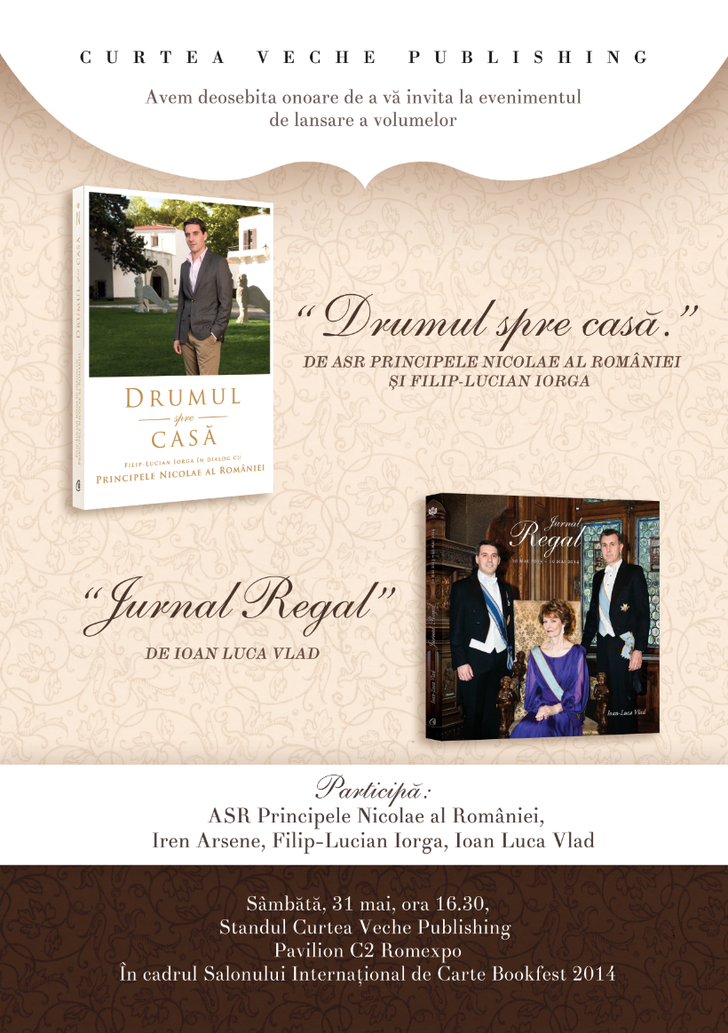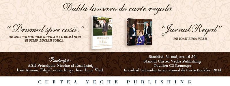 Curtea Veche Publishing vă invită la Salonul Internațional de Carte Bookfest 2014, la o dublă lansare de carte regală, în prezența ASR Principele Nicolae al României. Sâmbătă, 31 mai 2014, la ora 16.30, va avea loc lansarea volumelor “Jurnal Regal” de Ioan Luca Vlad și “Drumul spre casă” de ASR Principele Nicolae al României și Filip Lucian Iorga.