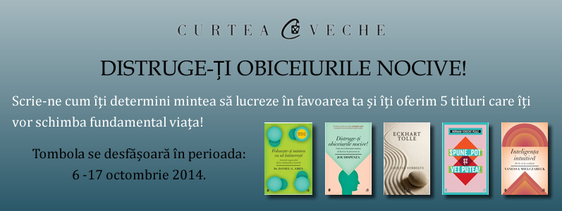 Scrie-ne pe adresa de e-mail concurs@curteaveche.ro cu subiectul: Distruge-ți obiceiurile nocive  5 tactici despre cum anume îți determini mintea să lucreze în favoarea ta și îți oferim un pachet de 5 carți care le vor schimba fundamental viața!