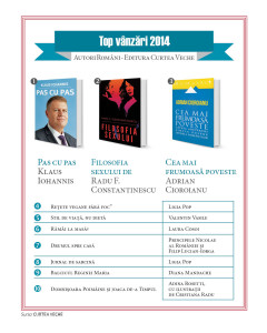 Iren Arsene: Pentru noi, anul 2014 a fost un an de excepție, care ne-a făcut să vedem piața într-un alt context. Recordurile marcate de volumul „Pas cu pas” al Președintelui României au scos în evidență diferențele dintre statutul actual al cărții și statutul pe care l-ar putea avea.În ultimii ani, suntem îngijorați de cifrele care arată cât de puțin se citește în România și încercăm să le aducem la un nivel acceptabil printr-un program național alternativ de lectură pentru copii. Ceea ce s-a întâmplat la Curtea Veche Publishing anul trecut a însemnat doar o dovadă că facem ceea ce trebuie. Cartea potrivită poate scoate la iveală un cititor pasiv acolo unde poate s-a crezut că el nu există.În afara acestui eveniment editorial cu totul special, schimbări majore nu am observat. Consumatorul este din ce în ce mai atent la calitate, deși rămâne la fel de sensibil la prețuri. Cititorii noștri apreciază la fel de mult cărțile care le pot arăta cum să investească în ei înșiși astfel încât să devină mai competitivi pe piața muncii, în mediul de business sau în viața personală.