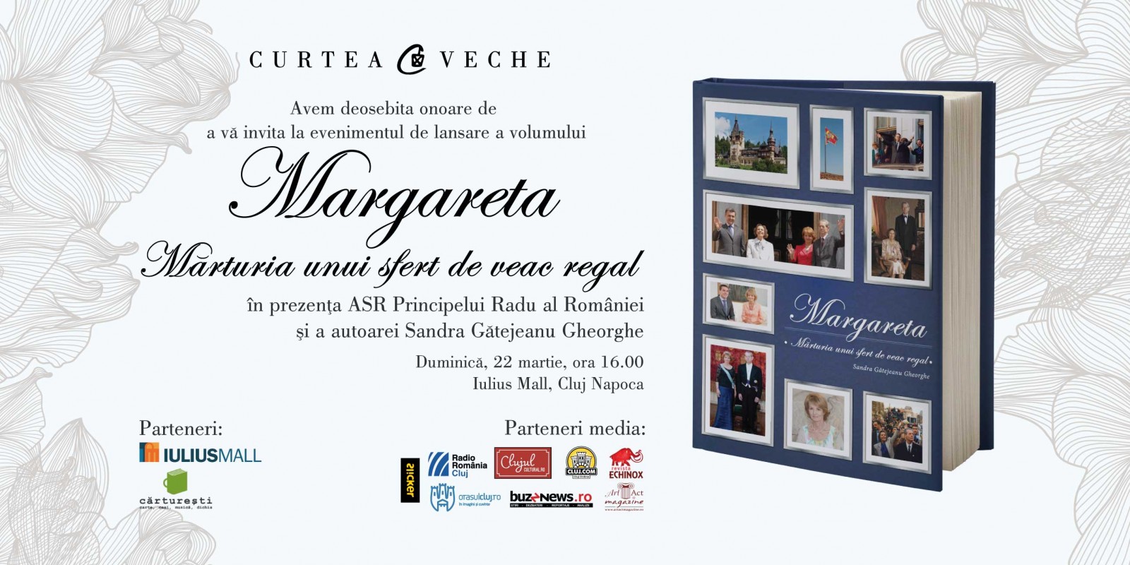 Curtea Veche Publishing lansează duminică, 22 martie, la Cluj Napoca, volumul “Margareta • Mărturia unui sfert de veac regal” de Sandra Gătejeanu Gheorghe, Director de Protocol al Casei Regale a României. Evenimentul va avea loc la ora 16.00, la Iulius Mall, în prezența Alteței Sale Regale Principelui Radu al României. Intrarea va fi liberă și include o sesiune de autografe.
