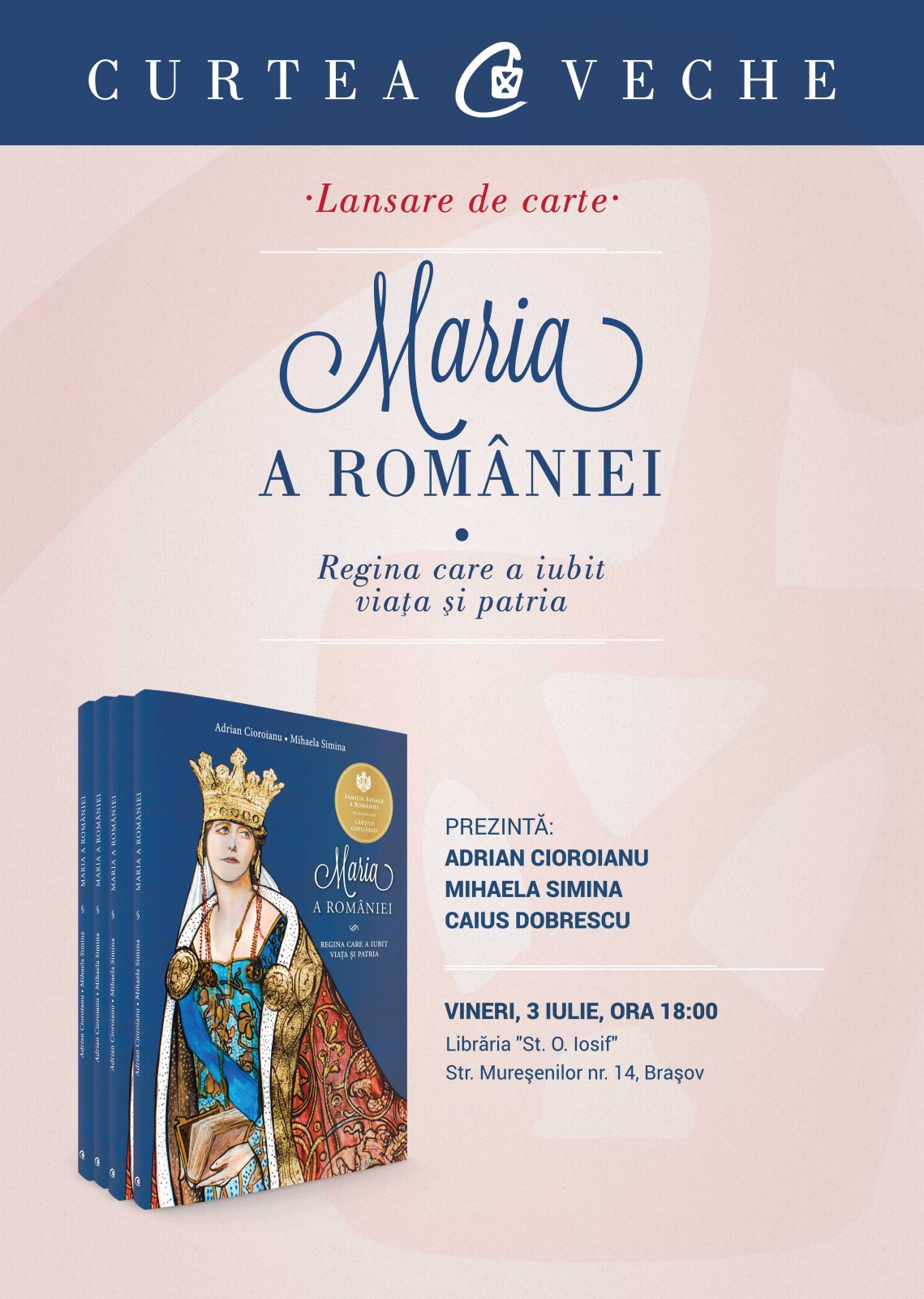 Curtea Veche Publishing lansează vineri, 3 iulie, la Brașov, volumul “Maria a României. Regina care a iubit viaţa şi patria”   de Adrian Cioroianu şi Mihaela Simina. Evenimentul va avea loc la ora 18.00, la “Librăria St. O. Iosif” (str. Mureșenilor nr. 14).