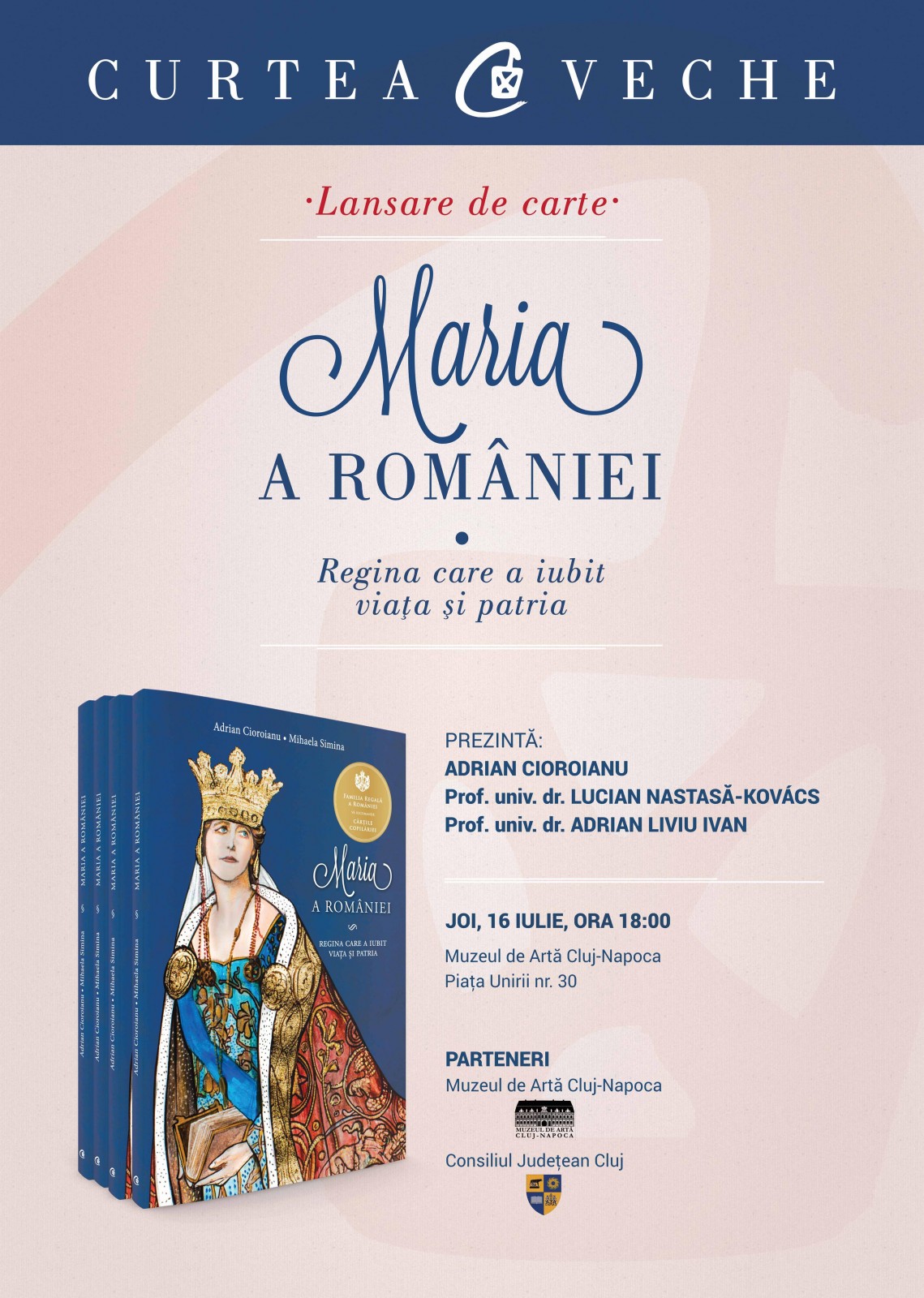 Curtea Veche Publishing lansează joi, 16 iulie, la Cluj, volumul “Maria a României. Regina care a iubit viaţa şi patria”de Adrian Cioroianu şi Mihaela Simina. Evenimentul va avea loc la ora 18.00, la Muzeul de Artă Cluj Napoca(Piața Unirii  nr. 30)și include o sesiune de autografe.