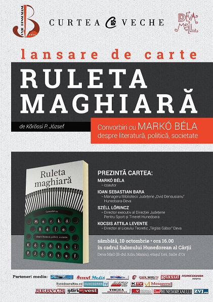 ruleta_maghiara_cop_1Biblioteca Județeană „Ovid Densusianu” Hunedoara – Deva, alături de Curtea Veche Publishing, lansează sâmbătă, 10 octombrie 2015, volumul „Ruleta maghiară. Convorbiri cu Markó Béla despre literatură, politică, societate” de Kőrössi P. József. Evenimentul face parte din Salonul Hunedorean al Cărții și va avea loc începând cu ora 16.00 în Deva Mall ( B-dl Iuliu Maniu, etaj 3, Salle d’Or).
