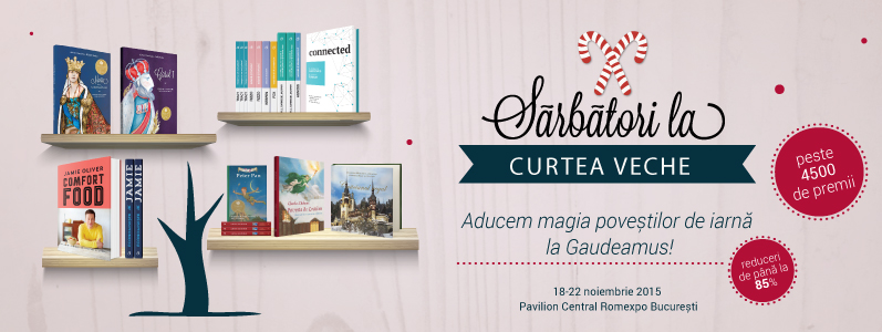 Curtea Veche Publishing vă invită la o nouă sărbătoare a cărții! Anul acesta, în cadrul Târgului Internaţional GAUDEAMUS – Carte de învăţătură 2015, ediţia a XXII-a, ce se va desfășura în perioada 18 – 22 noiembrie în Pavilionul Central Romexpo din Bucureşti, vă așteptăm cu titluri variate, reduceri de preț de până la 85% la peste 600 de titluri, întâlniri cu autori cunoscuți, ateliere pentru copii și peste 4500 de premii pentru Cititorii de Curtea Veche!