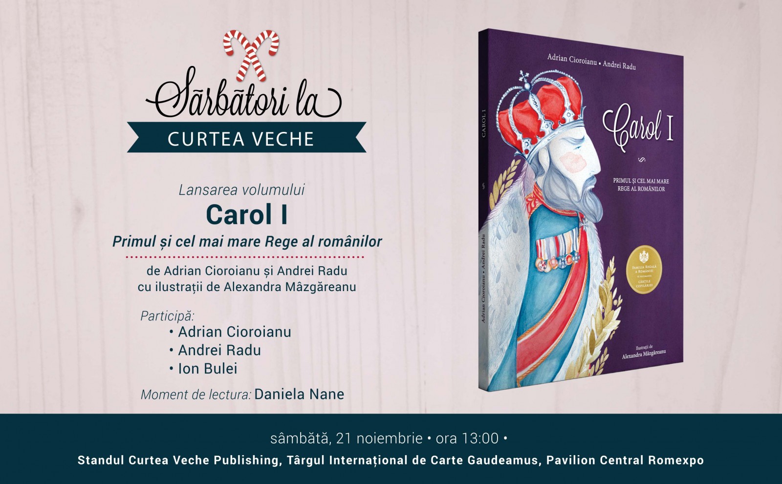 Sâmbătă, 21 noiembrie, începând cu ora 13.00, Curtea Veche Publishing vă invită la evenimentul de lansare a volumului „Carol I. Primul și cel mai mare Rege al românilor” de Andrei Radu și Adrian Cioroianu, cu ilustrații de Alexandra Măzgăreanu. Evenimentul va avea loc la standul editurii, în Pavilionul Central Romexpo. Vă vor întâmpina cei doi autori, istoricul Ion Bulei și actrița Daniela Nane, care va susține un moment de lectură. Oficiile de gazdă vor fi făcute de Miruna Meiroșu, PR Manager Curtea Veche Publishing. Lansarea va cuprinde o sesiune de autografe.