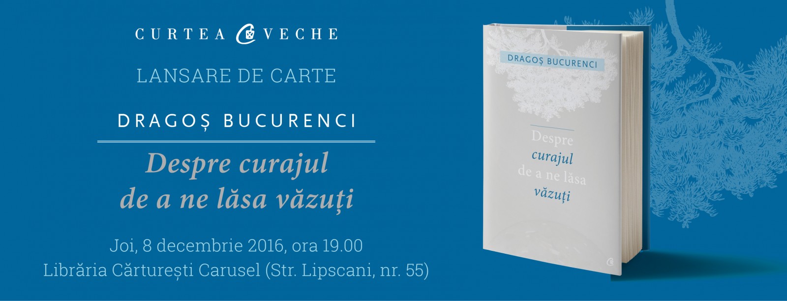 Vă invităm joi, 8 decembrie 2016, începând cu ora 19.00, la Cărturești Carusel (Strada Lipscani 55) pentru a vorbi „Despre curajul de a ne lăsa văzuți”, noul titlu semnat de Dragoș Bucurenci. Alături de autor vor participa realizatorul TV Cătălin Ștefănescu, consultantul de business Cosmin Alexandru, decan al The Entrepreneurship Academy, și Iren Arsene, director general al Curtea Veche Publishing. Evenimentul va fi urmat de o sesiune de autografe. Intrarea este liberă.