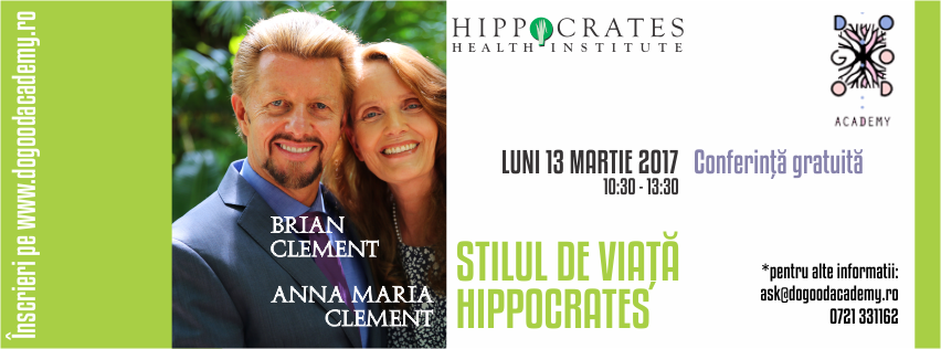 La început de primăvară vă recomandăm Conferința Stilul de Viață Hippocrates, ce va avea loc luni, 13 martie, la Hotel Caro în București. Gazdele acestui eveniment sunt Brian Clement, director al Hippocrates Health Institute și Anna Maria Clement, co-Director al aceluiași institut.