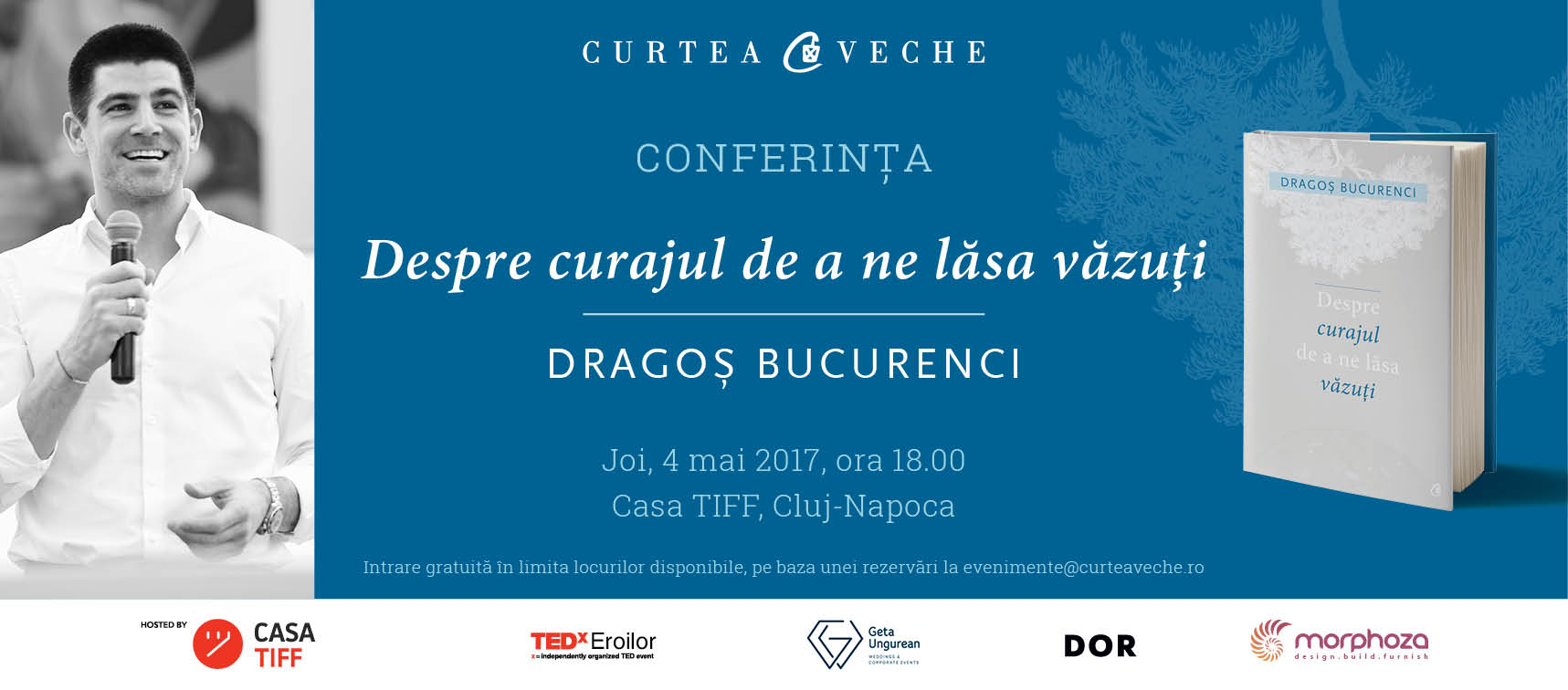 Curtea Veche Publishing are plăcerea de a vă invita joi, 4 mai 2017, începând cu ora 18.00, la Casa TIFF (Strada Universității, nr. 6, Cluj-Napoca) pentru a lua parte la conferința “Despre curajul de a ne lăsa văzuți”, o pledoarie pentru vulnerabilitate susținută de Dragoș Bucurenci alături de invitatul său, cunoscutul psiholog Mircea Miclea. Evenimentul va fi deschis de Miruna Meiroșu, PR Manager Curtea Veche Publishing, și va include lansarea cărții “Despre curajul de a ne lăsa văzuți” de Dragoș Bucurenci, precum și o sesiune de autografe.