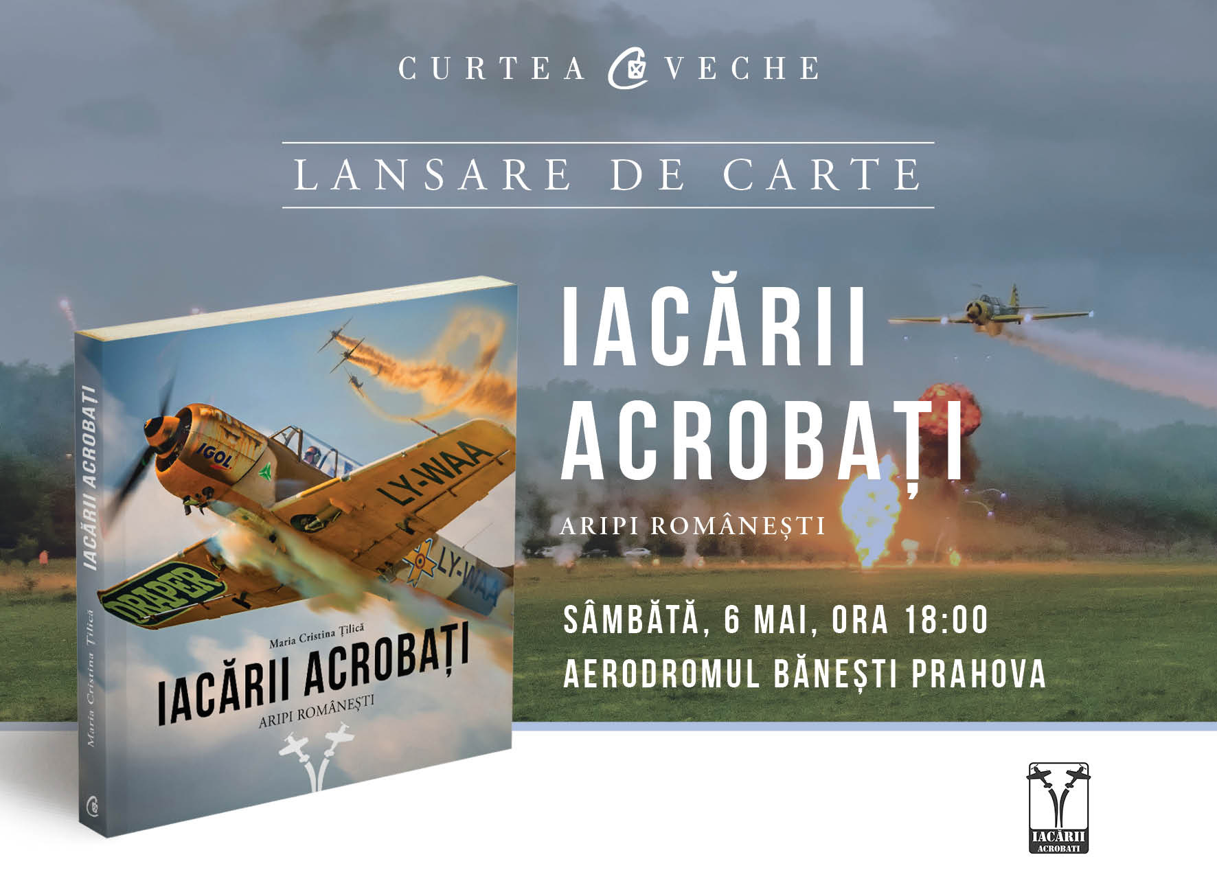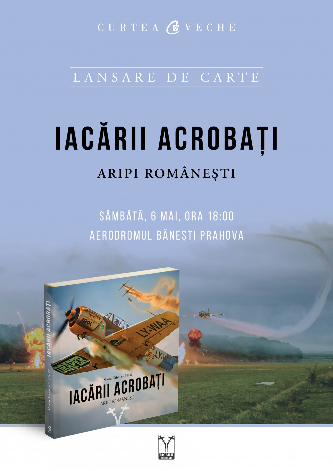Curtea Veche Publishing vă invită la evenimentul de lansare a cărții “Iacării Acrobați. Aripi românești” de Maria Cristina Țilică, o carte care dezvăluie povestea aviatorilor români din cea mai îndrăgită formație de acrobație aeriană. Cine sunt cei care sfidează înălţimile şi uimesc la spectacolele aviatice? Câtă muncă şi dăruire se ascund în spatele uluitoarelor acrobaţii care redesenează cerul? Ne-o spun chiar ei – Iacării Acrobați, membrii singurei echipe independente de acrobație aeriană din România.