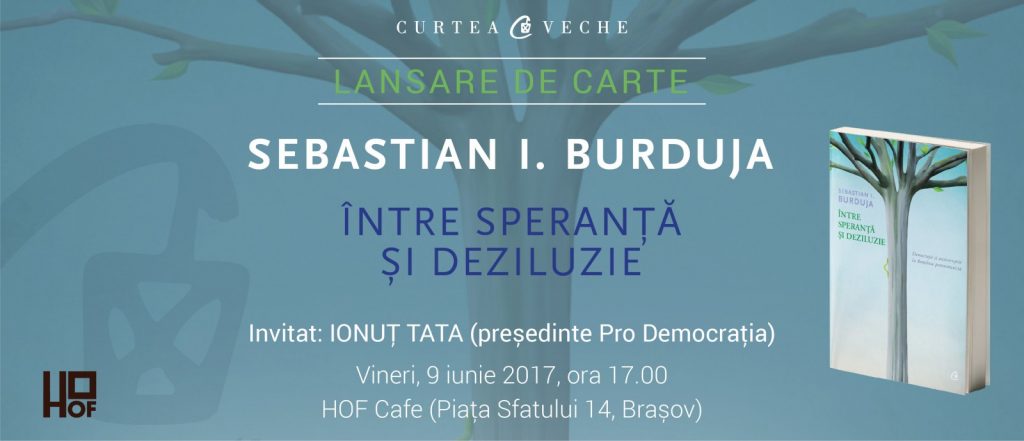 Curtea Veche Publishing și HOF Cafe vă invită vineri, 9 iunie 2017, la Brașov la evenimentul de lansare a cărții Între speranță și deziluzie de Sebastian I. Burduja. Lansarea va începe la ora 17.00 și va avea loc la HOF Cafe (Piața Sfatului 14). Alături de autor, va participa Ionuț Țața, președinte Pro Democrația. Evenimentul va include și o sesiune de autografe.