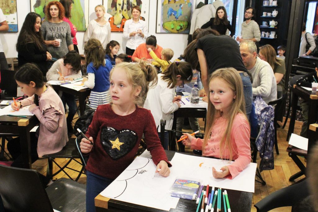 Atmosfera a devenit din ce în ce mai ludică – în a doua parte a atelierului de povești, copiii au avut ocazia să deseneze alături de ilustratoarea Lavinia Fălcan și să vină în fața tuturor la microfon să dea mai multe detalii despre ceea ce au desenat.