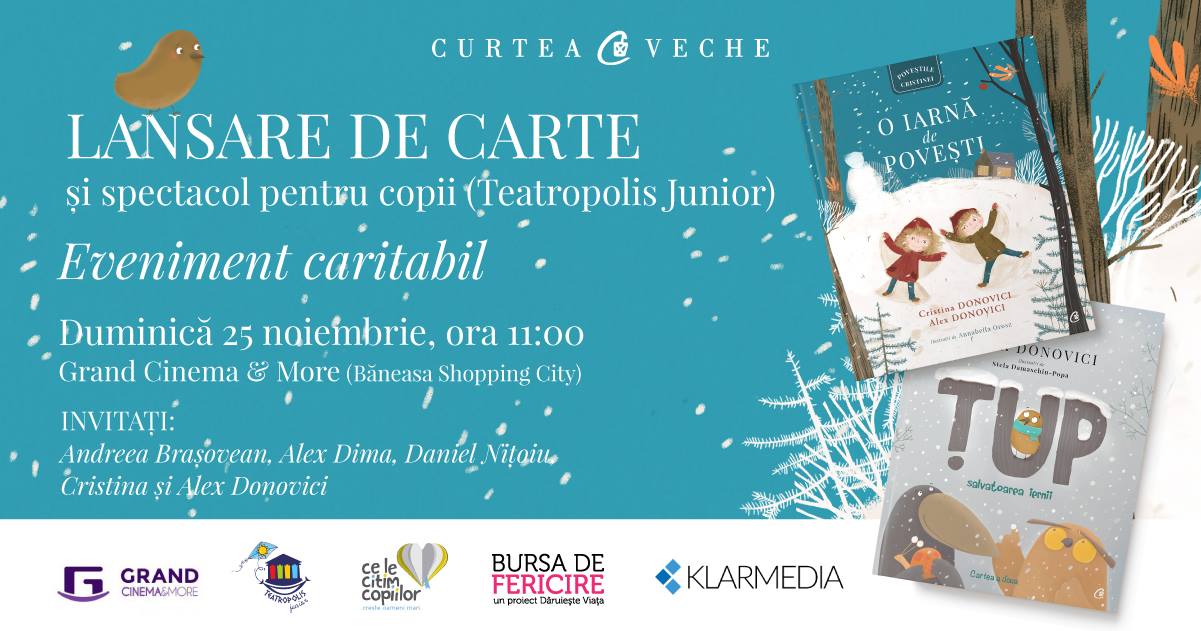 Curtea Veche Publishing și Grand Cinema & More vă invită la un nou eveniment din seria Poveştile Cristinei. Duminica, 25 noiembrie 2018, de la ora 11:00 se lansează două noi cărţi de Cristina și Alex Donovici: „Ţup, salvatoarea iernii” (ilustrată de Stela Damaschin-Popa) și „O iarnă de povești” (cu ilustraţii de Annabella Orosz). Evenimentul va avea loc în Sala Epika din Grand Cinema & More (Băneasa Shopping City), iar intrarea va fi pe bază de donaţie minimă. Toate donaţiile merg către Asociaţia Dăruieşte Viaţa pentru construcţia primului spital de oncologie și radioterapie pentru copii din România.
