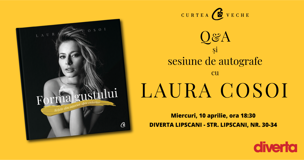 Curtea Veche Publishing și Diverta Lipscani vă invită miercuri, 10 aprilie, de la ora 18:30, să intraţi într-o discuţie cu Laura Cosoi despre ce înseamnă fericirea, alimentaţia echilibrată și împlinirea de sine. „Forma gustului. Reţete din interior spre exterior” este noua sa carte care îmbina reţete uşor de preparat, ce conţin ingrediente alese cu grija, cu un joc al formelor și o călătorie a descoperirii de sine prin fotografii realizate de Alex Gălmeanu. Evenimentul include o sesiune de autografe cu autoarea și va avea loc în noul magazin Diverta Lipscani (Str. Lipscani nr. 30-34).