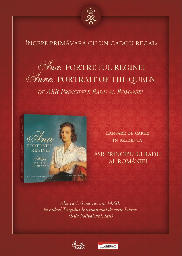Curtea Veche Publishing lansează în Iaşi miercuri, 6 martie, începând cu ora 14.00, volumul bilingv româno-englez “Ana. Portretul Reginei/ Portrait of the Queen”, semnat de ASR Principele Radu al României. Lansarea va avea loc în cadrul Târgului Internaţional de Carte LIBREX, în incinta Sălii Polivalente din Iaşi, în prezenţa Alteţei Sale Regale Principelui Radu.