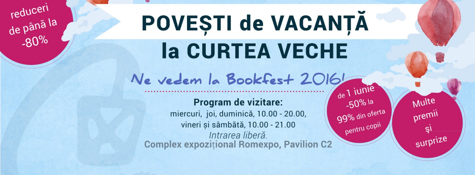 Miercuri, 1 iunie Reduceri de minim 50% la 99% din oferta de carte pentru copii. Cadouri SLooP la achiziționarea volumului… Evenimente Curtea Veche Publishing la Bookfest 2016